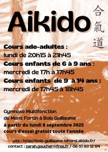 Les cours reprennent à partir du lundi 08 septembre 2025 de 20h15 à 21h45 (Cours ado-adultes à partir de 14 ans) et du mercredi 10 septembre 2025 de 17h – 17h45 (6 – 9 ans) et 17h45 – 18h45 (9 ans et +) au Gymnase Multifonction du Mont Fortin, 491 rue Robert Pinchon à Bois Guillaume (en Seine-Maritime).